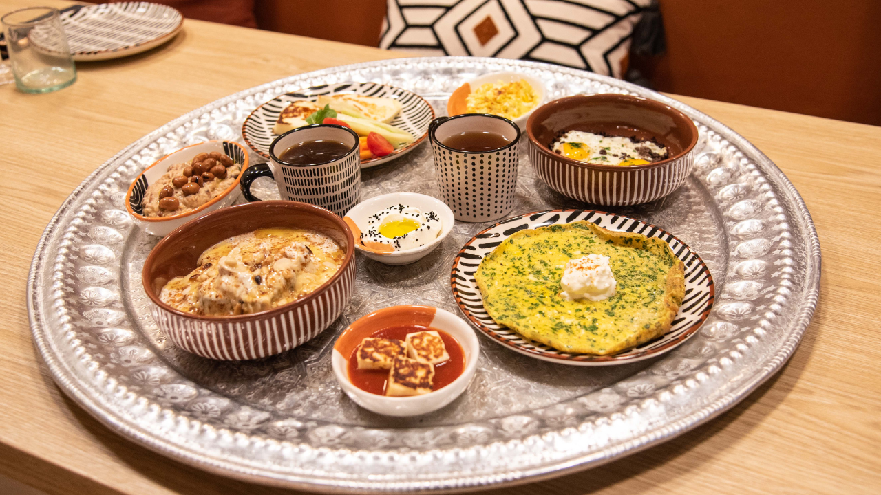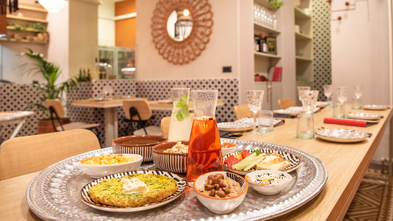 Mezè è aperto non solo a pranzo e a cena, ma anche per la prima colazione (la domenica mattina nel periodo invernale e sabato e domenica d’estate) con un’offerta di tanti assaggi dolci e salati, uova in diverse versioni, l’halloumi con composta di pomodori, e hummus di barbabietola al Kataif con aactha e noci. Il tutto accompagnato da caffè, tè e limonata ai fiori d’arancio.