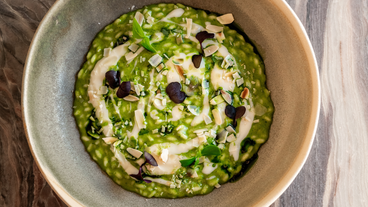 Risotto cotto in estrazione di basilico, crema di Parmigiano 30 mesi e pesto di mandorle trapanesi