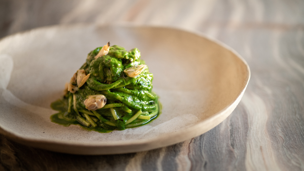 Spaghettone con vongole veraci e pesto di prezzemolo