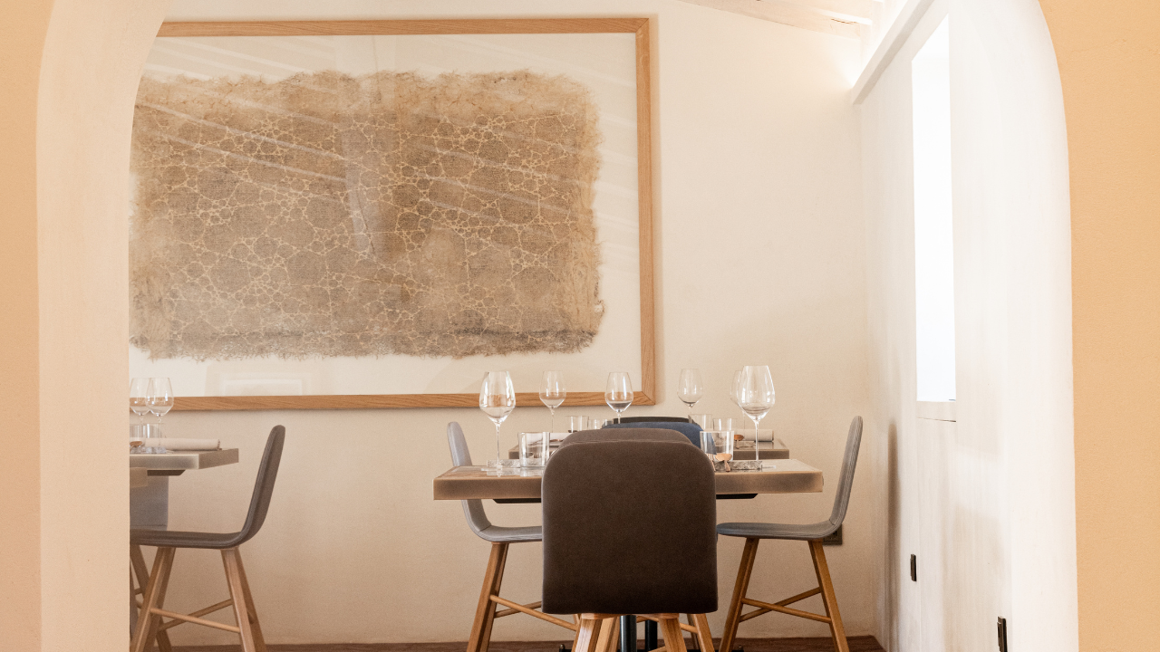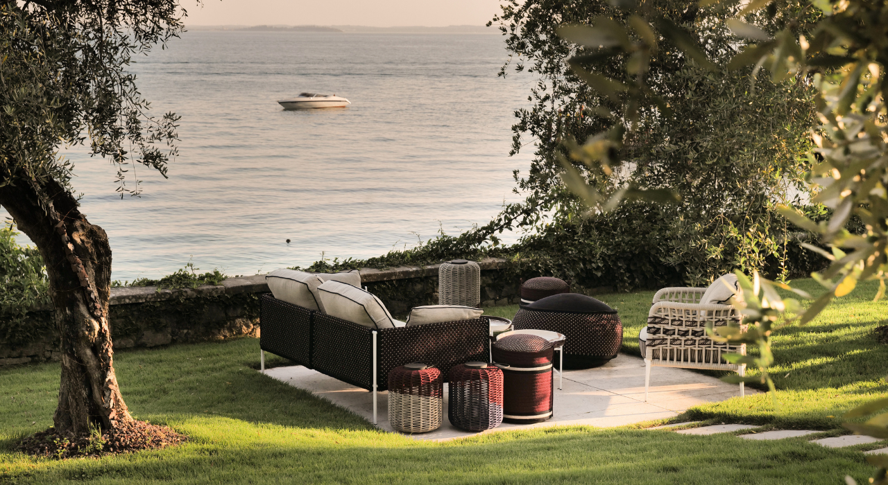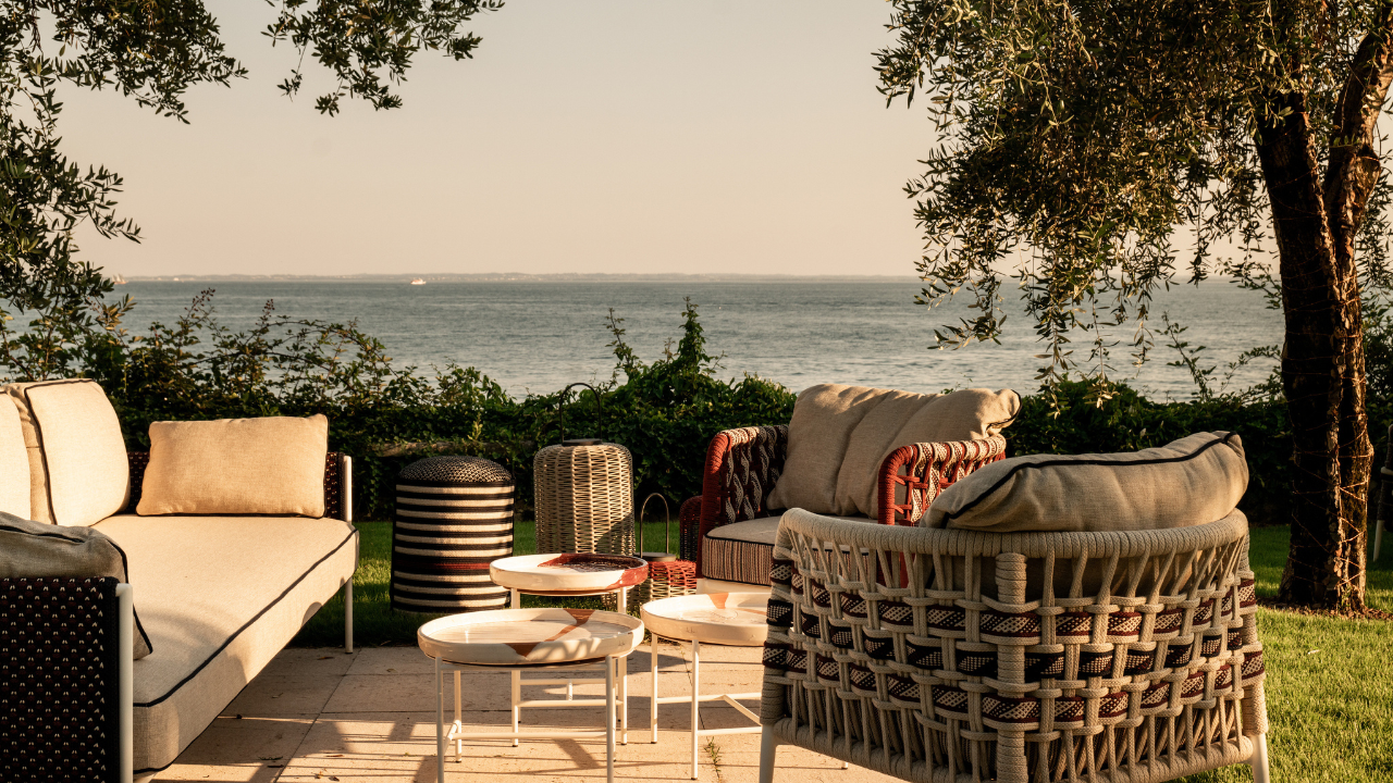 E sempre il filo della memoria continua a scorrere presso le due sale interne, tra i tavoli realizzati in marmo azzurro e blu in onore dei movimenti inaspettati dell’acqua, sui muri dipinti di color latte, con pennellate mosse e corpose, in contrasto con il pavimento di cotto esagonale, creato a mano e dipinto una mattonella dopo l’altra in una irripetibile calda sfumatura amaranto da Cantieri Creativi. Ma questo filo non è solo simbolico: due inaspettate opere di Diana Sherer, artista contemporanea tedesca, ci mostrano la meraviglia della natura: manufatti irripetibili, le opere sono realizzate utilizzando le radici delle piante che ricreano “tessuti botanici” dai toni crema, trasformandosi in arazzi naturali che indagano il rapporto simbiotico tra uomo e radici. Sulle mura interne del ristorante si trova anche uno dei suggestivi pannelli di betulla di Wycliffe Stutchbury, scultore britannico le cui opere si ispirano alla campagna, luogo per lui feticcio, dove ha passato la maggior parte della sua vita, e richiamano paesaggi e scenari immaginifici, guidati da linee e onde. Linee ed onde che si ritrovano anche scolpite in marmo nella statua di una fanciulla greca, risalente al periodo tra il IV e il II secolo a.C, avvolta da una veste scolpita nella pietra che sembra conversare col vento. Poco lontano dal suo abito leggero ed eterno, in una impressionate eco, ci si imbatte in una splendida opera fotografica di Mario Giacomelli intitolata “Studi sulla natura”. Fotografata dal cielo, la terra cruda, con i suoi solchi profondi e dolenti, fa riecheggiare le stesse pieghe della veste greca. Ecco allora l’ipnotico e mistico tema della trama, che va ben oltre il canonico tessuto per esplorare l’intreccio delle arti, dei secoli, delle esistenze. Come in un rifugio protetto dalla corrosione del tempo, le opere custodite presso il Riviera uniscono arti, lingue e periodi storici diversi annodando tutto intorno alla domanda sulla vera natura dell’eternità e di come essa dialoghi con la bellezza. All’interno, perciò, ci sono spazi molto raccolti ed armoniosi che, insieme a questa collezione d’arte, accolgono otto tavoli che si rivolgono, grazie alle porte finestre in legno, da un lato al giardino fiorito e dall’altro all’antica via di ciottoli che porta al molo. All’esterno, racchiuso dalle antiche mura del Cinquecento con mattoni a vista, c’è invece un giardino profumato di erbe selvatiche e fiori eduli. Ricorda un locus amenus dell’Arcadia, un hortus conclusus medievale, il giardino dell’Eden. Al suo fianco si trova un patio di cristallo, la terza sala del Ristorante Riviera. Qui altri dodici tavoli di marmo parlano con i colori della terra, e tutt’intorno l’erba fresca e le piante donano una sensazione di pace e benessere. In questo punto del lago di Garda unico al mondo, la natura assume mille sfaccettature di verde, dallo smeraldo al verde Francia, dal verderame al verde acqua. Qui le rive della spiaggia brillano per i finissimi ciottoli bianchi misti a sabbia, le onde si infrangono morbide sulla sponda e la brezza lacustre smuove i rami dei più di mille ulivi secolari disseminati su prati rigogliosi e il canto quasi assordante delle cicale si mischia ai versi dei gabbiani e delle anatre. Tutto questo, oltre al prelibato ristorante, è Riviera, il nuovo progetto della famiglia Rana a Punta San Vigilio, sul lago di Garda.