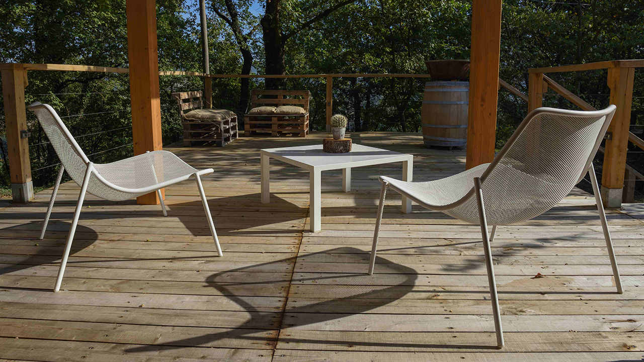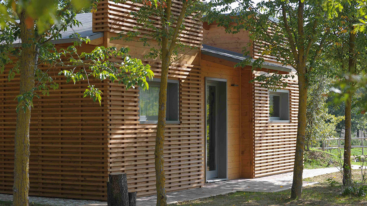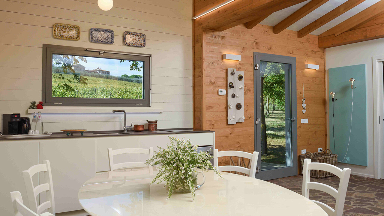 Lo Chalet è stato progettato e costruito seguendo i dettami dell’architettura sostenibile con una particolare attenzione all’ambiente e facendo uso delle più moderne tecnologie per il risparmio energetico. La natura è infatti protagonista assoluta; si vive immersi completamente nel verde e nella luce, grazie alle grandi vetrate che danno direttamente sul bosco e sulla distesa dei vigneti; nelle giornate di sole il patio diventa il luogo più bello della casa dove prendere un aperitivo al tramonto o sdraiarsi comodamente a leggere e rilassarsi ascoltando solo il canto degli uccellini tutto attorno. Il bagno è un piccolo gioiello decorato a maioliche colorate di Deruta, fra le più prestigiose in Italia. Gli arredi, minimali ed essenziali, sono stati curati da Caporali Contract, mentre le installazioni artistiche interne dai maestri scultori Auro e Celso Ceccobelli con l’aggiunta di opere grafiche di Piero Dorazio.