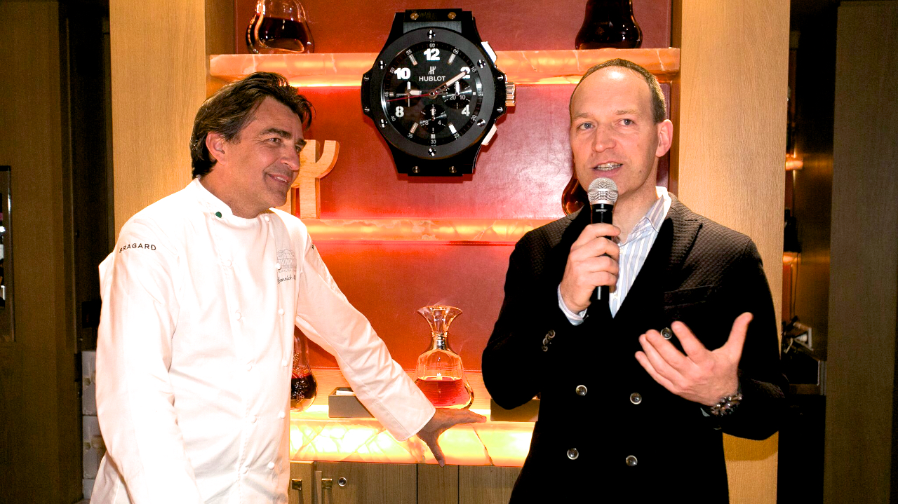 Durante un cocktail ai sapori di montagna ideato da Yannick Alléno al Bar, gli ospiti hanno partecipato ad una sessione di “cucina dal vivo” e degustato un inedito “Sushi alpino” preparato davanti a loro. Musica dal vivo e danzatori del fuoco hanno animato la serata, all’insegna della fusione tra Terroir e Modernità. L’Arte della Fusione, il motto di Hublot, accomuna la Maison svizzera e lo Chef, che ieri sera hanno siglato la loro collaborazione. Dopo aver flambato al genepì un dolce a forma di montagna accompagnato dalla H stilizzata di Hublot, il Chief Marketing Officer Philippe Tardivel ha consegnato simbolicamente a Yannick Alléno, chef due volte tre stelle Michelin, il grembiule di orologiaio Hublot ricamato con il suo nome.