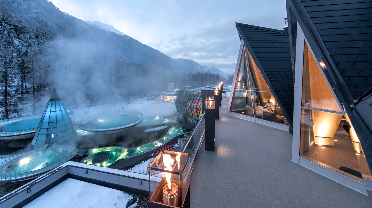Dall’hotel, gli ospiti possono raggiungere la zona termale di Aqua Dome in accappatoio, grazie a un corridoio riscaldato, e hanno accesso a tutte le spettacolari piscine di acqua termale, sia interne sia esterne, tra cui due piscine saline; una decina di saune e bagni turchi dove rigenerarsi al tepore del vapore salino o a quello della sauna aromatizzata.