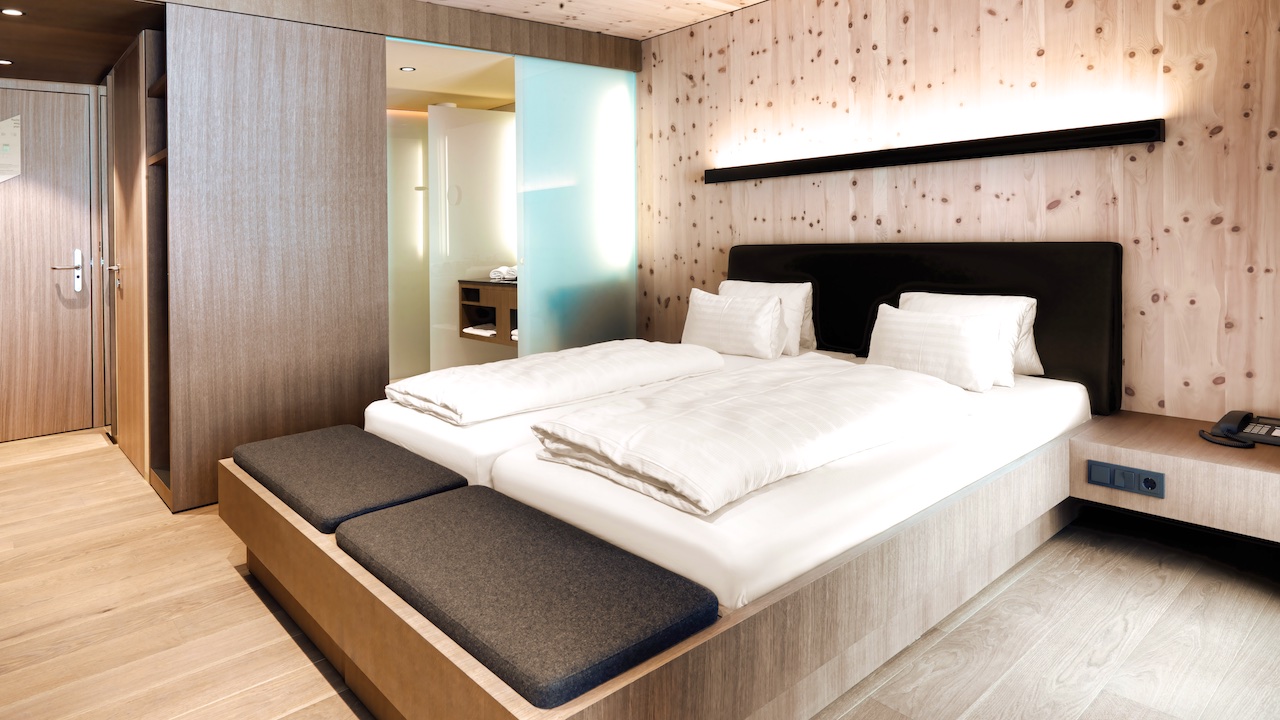 Le camere e le junior suite sono tutte rifinite con pino cembro e provviste di un panoramico bow window in cui è possibile anche dormire dopo aver contemplato le stelle (Prezzi a partire da 142 € a persona a notte, con trattamento pensione gourmet che include: colazione a buffet con specialità del Tirolo Orientale, afternoon tea, cena a più portate, accesso alle piscine e all‘area wellness e sauna).