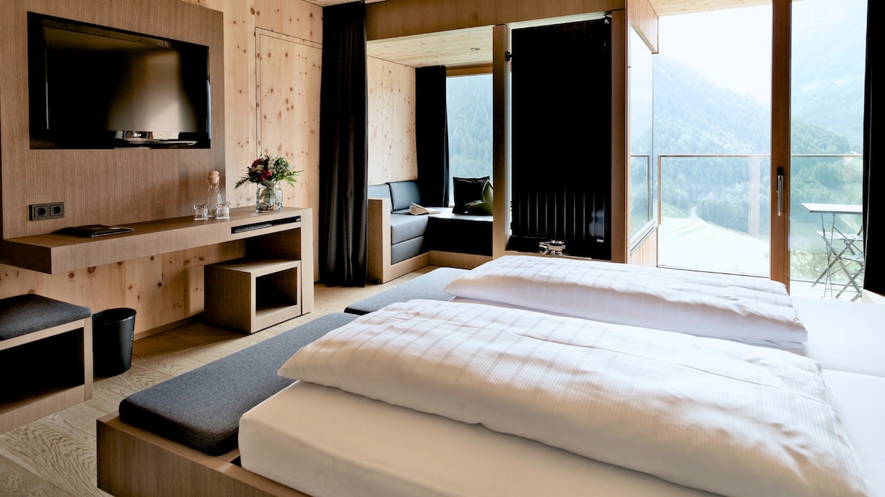 I tessuti utilizzati nelle camere e in generale nella struttura sono tutti di fibre naturali: lino, Loden e feltro. E gli scenografici “bow window” a sbalzo sul Parco Nazionale degli Alti Tauri, si trasformano in un piacevole angolo relax o in un suggestivo spazio per i bambini che, qui, possono dormire guardando le stelle.