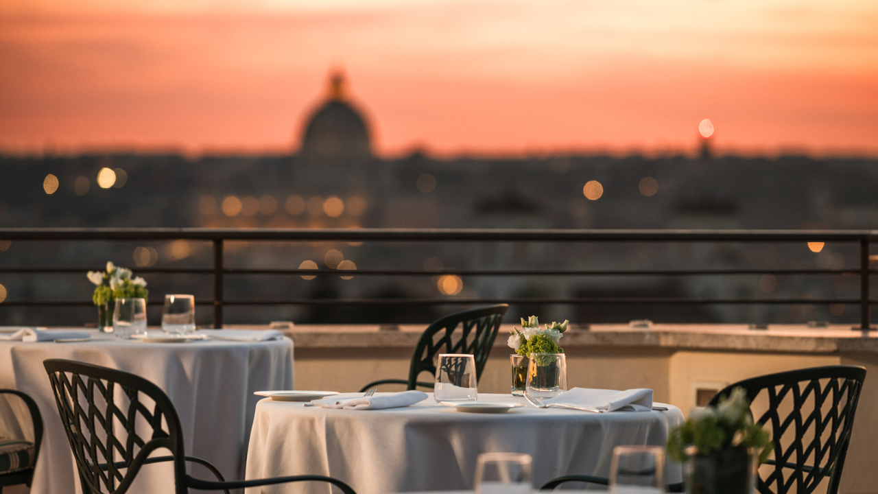 La terrazza al settimo piano, il Flora Roof Restaurant & Cocktail Bar, è il “fiore all’occhiello” di questa destinazione perché accoglie “en plein air” la sua clientela con colazioni con vista sulle bellezze di Roma e aperitivi al tramonto con Djset, cena e after dinner, tra da due ambienti: l’area lounge per aperitivi e dopo cena e la zona ristorante che corre sul lato lungo della facciata dello storico palazzo. Se quest’ultimo ambiente ospita una mise en place più classica, che non rinuncia al tovagliato bianco per dare un tocco di charme tutto italiano, la seconda area si caratterizza per il décor che pur restando elegante punta a un glamour fresco, con tavolini in ferro battuto, cuscini bianchi e verdi delle sedute e dei divanetti.