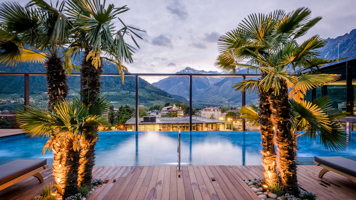 Un’esperienza che non può prescindere dalla parte wellness con ben tre SPA a disposizione. La panoramica Sky SPA sul roof top, accessibile a chi ha più di 14 anni, sviluppata su 3.200 m2 con vista a 360° sui tetti di Merano, sul Kurhaus e le cime del Gruppo di Tessa, dove riscoprire la cultura europea e asiatica del benessere, attraverso i quattro elementi acqua, terra, fuoco, aria, che preservano vigore ed equilibrio.