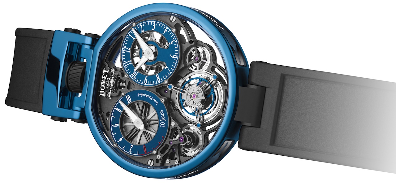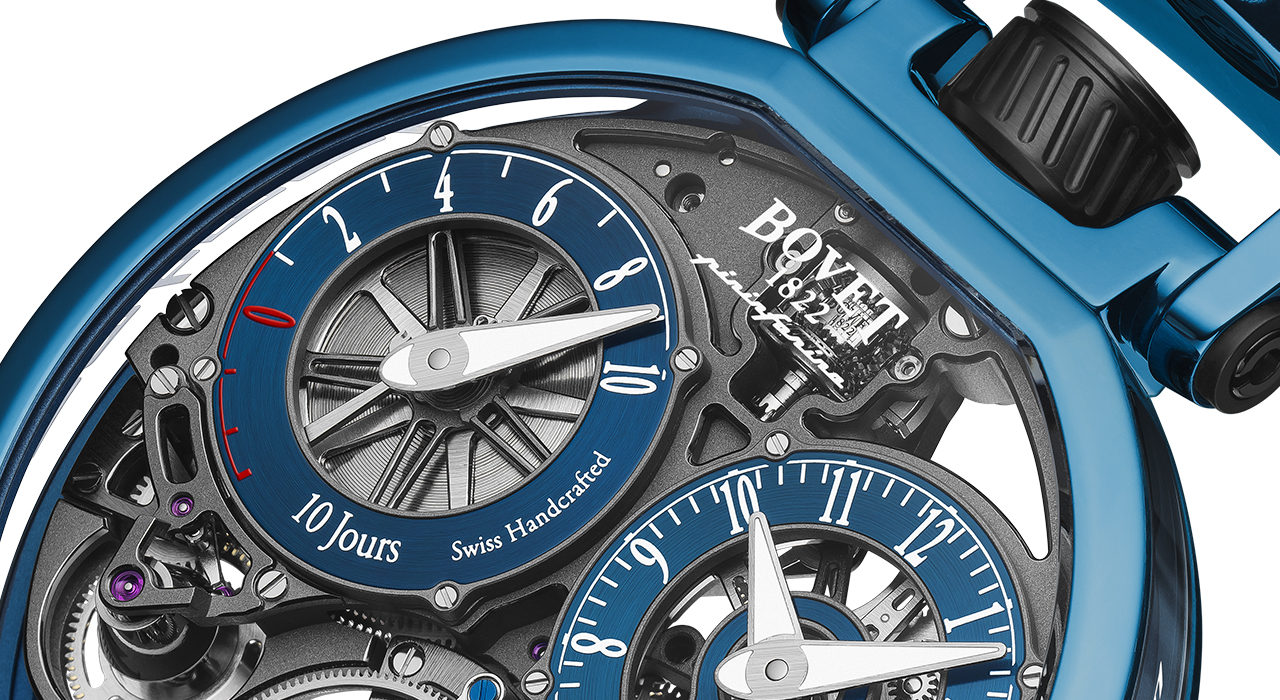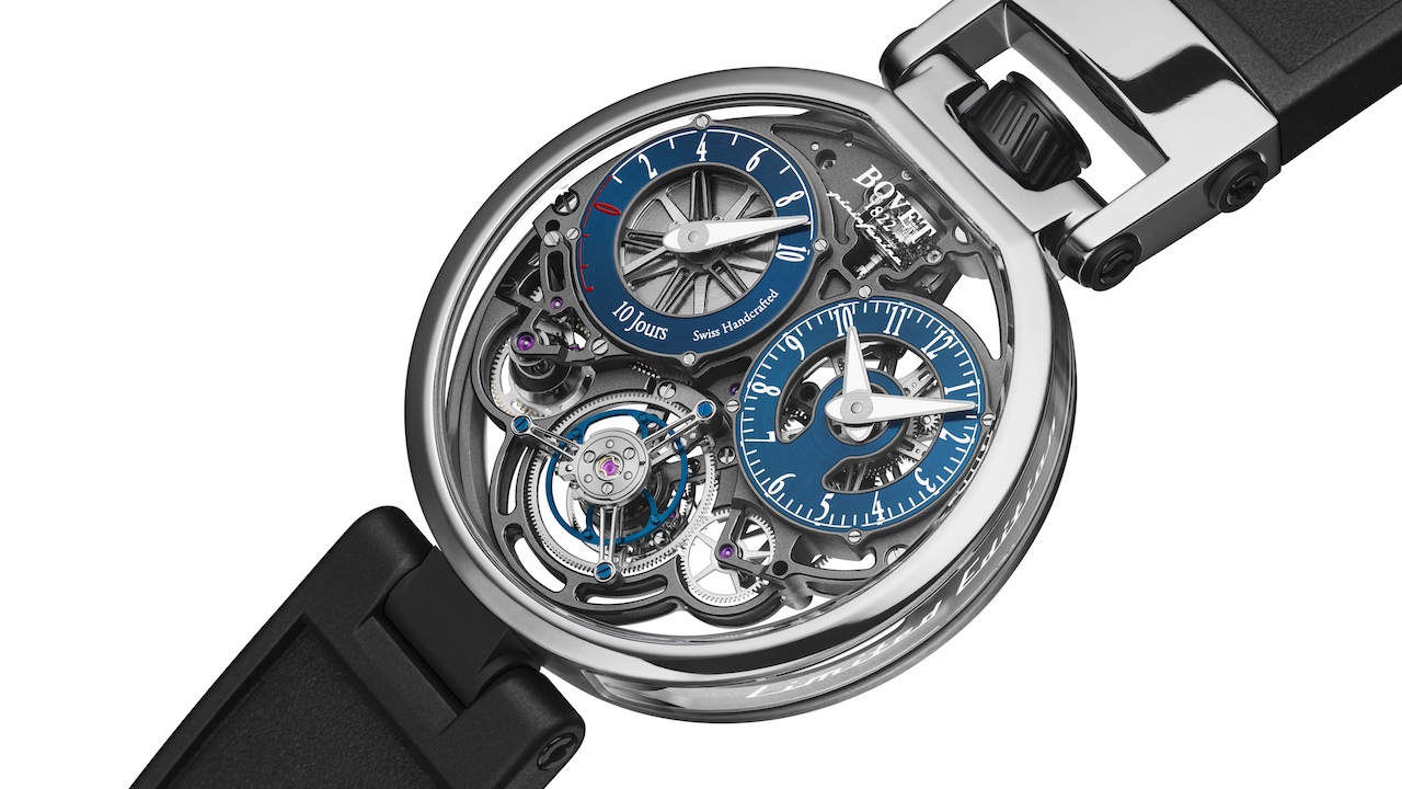Gli artigiani di Bovet realizzarono varie prodezze, comprese la lavorazione meccanica e la decorazione tridimensionale della platina. Per non diminuire la trasparenza laterale creata dai vetri in zaffiro originali che circondano la carrure, i tecnici di BOVET idearono un’ingegnosa cassa che inoltre riduce considerevolmente lo spessore del segnatempo. Anche solo le caratteristiche tecniche soddisferebbero gli esperti più esigenti. Un unico bariletto fa girare il tourbillon volante double-face per più di 10 giorni. L’architettura e il design del tourbillon aumentano sia la precisione che la trasparenza del segnatempo, dato che i suoi accessori sono praticamente invisibili. Infine, un ingranaggio differenziale sferico dimezza il tempo necessario per caricare l’orologio senza aumentare la torsione del meccanismo di carica. Tutte queste innovazioni condussero alla registrazione di tre brevetti internazionali.