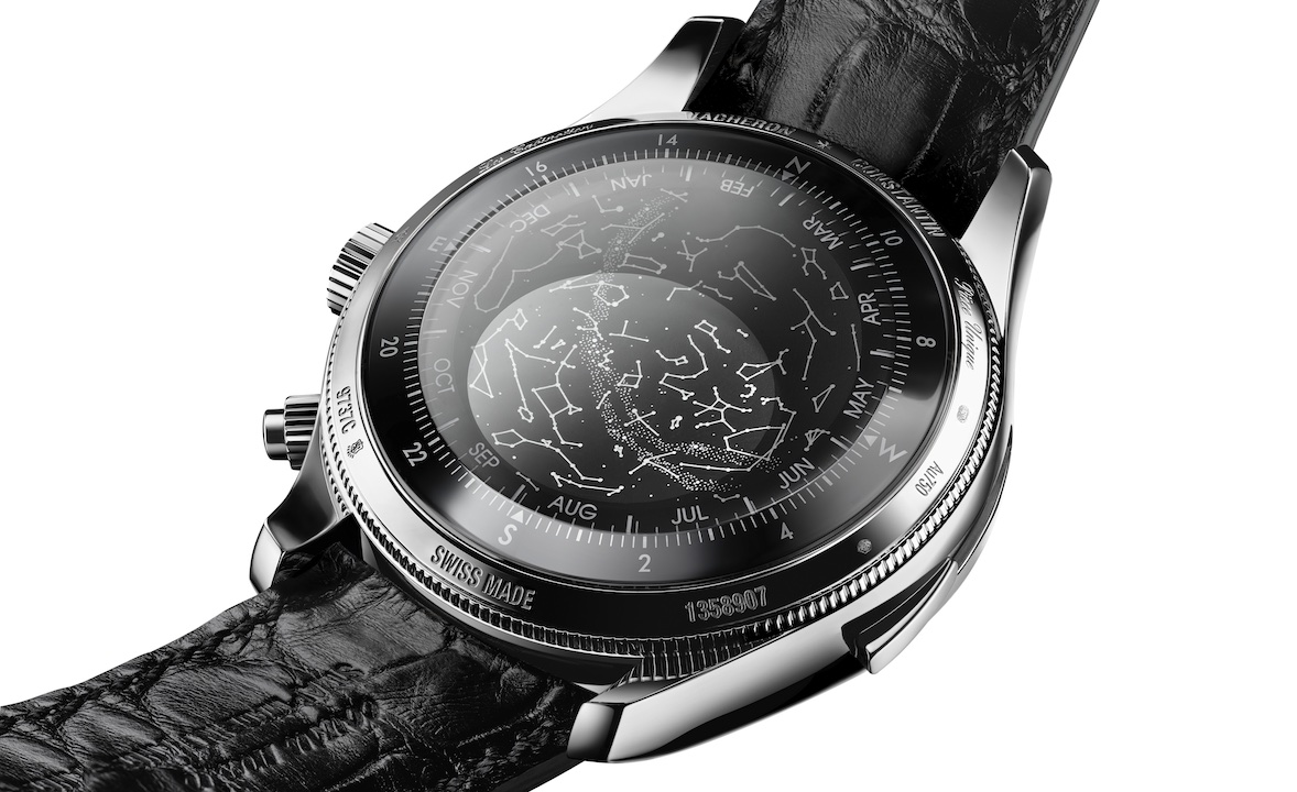 La veduta del cosmo è ulteriormente sottolineata dalla carta celeste visibile sul fondello. Nella rappresentazione del cielo notturno che sovrasta Ginevra, la Via Lattea, le costellazioni e gli astri brillano vivacemente, e sembrano quasi visti attraverso un telescopio. La volta celeste esegue una rotazione completa sul suo asse in 23 ore e 56 minuti, ovvero un giorno siderale.