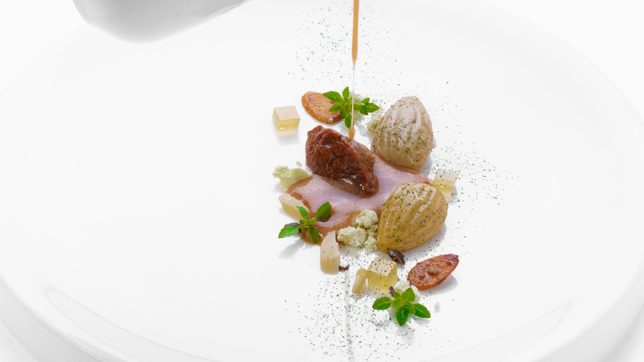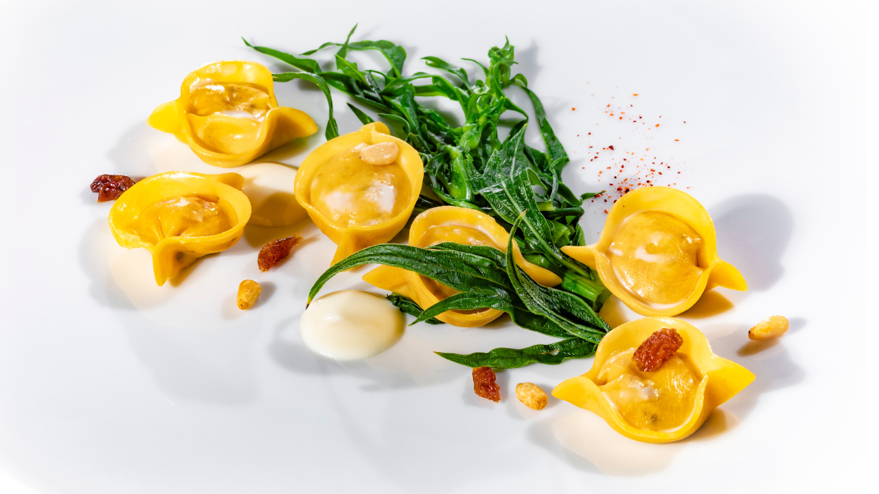 La massima espressione di questo concetto si trova in uno dei signature dello chef: Tortelli ripieni di genovese con pastinaca, perle di aceto balsamico di Modena e un brodo di Parmigiano Reggiano 30 mesi. Qua, grazie al ripieno, il riferimento alle origini dello chef è chiaro, com’è altrettanto chiaro il lavoro e la ricerca fatta per trovare un equilibrio nel piatto.