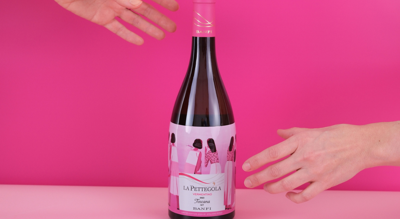 Quest’anno è toccato a Emiliano Ponzi l’onere e l’onore di raccontare attraverso un’immagine lo spirito di La Pettegola, la sua vera essenza. L’artista, nato a Reggio Emilia ma di base a New York, ha interpretato La Pettegola come una voce, una confidenza sussurrata da un orecchio all’altro, all’infinito. In un mondo dove il telefonino ha soppiantato le conversazioni di persona, dove tutto sembra dover passare attraverso uno schermo, l’artista ha voluto riprendere la tradizione della trasmissione orale, del chiacchiericcio, del bisbiglio. Il tutto si svolge sotto lo sguardo curioso e un po’ beffardo della vera pettegola, l’uccellino che dà il nome al vermentino di Banfi, che quest’anno appare in tre posizioni diverse all’interno dell’illustrazione: tre edizioni limitate in una. I colori sono quelli del magenta, i cui dettagli sfumano proprio come le parole sussurrate tra un soggetto e l’altro. Con la realtà aumentata l’etichetta prende vita. “Il primo soggetto riceve il pettegolezzo e lo riferisce al secondo, in un loop infinito”, dice Ponzi, che continua: “Mi piace pensare che ogni persona ritratta nel mio artwork venga a conoscenza non tanto di un gossip, quanto di una confidenza intima sussurrata all’orecchio, magari dopo un paio di bicchieri di Vermentino. Ed è proprio la pettegola, quella vera, a cinguettarla per prima”. Il vermentino La Pettegola è stato prodotto per la prima volta nel 2012; a partire dal 2018 prevede un’edizione limitata (ventimila bottiglie per la 2024) firmata, ogni anno, da artisti e designer di fama internazionale. La prima è stata disegnata da Alessandro Baronciani, nel 2019 è stata la volta di Ale Giorgini, a cui sono seguiti Riccardo Guasco nel 2020, Elena Salmistraro nel 2021, i Van Orton per l’edizione 2022 e Noma Bar per la 2023.