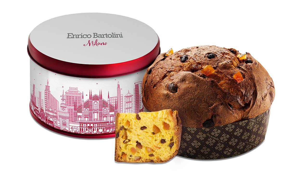 Nove stelle Michelin per il toscano Bartolini, classe 1979, collezionate fino ad oggi, totalizzando anche il record mondiale di averne ricevute 4 in un colpo solo, di cui due al Mudec di Milano, la sua roccaforte. Un panettone per la prima volta firmato dallo chef originario di Castelmartini, grazie all’impiego di lievito madre naturale, lievitazioni 72 ore, uva sultanina, canditure home made di arance e limoni calabresi, che ricalca una ricetta tradizionale. La fetta è ben alveolata e il morso è idratato, soffice, fragrante, di notevole concentrazione e freschezza. “Ho lavorato su un’antica ricetta – racconta Bartolini – apparentemente semplice ma di notevole bontà e piacevolezza. Ho scelto ingredienti speciali, dedicandomi in particolar modo alla qualità dei canditi che personalizzano il sapore e il retrogusto di questo panettone classico”. Elegante e prezioso il packaging meneghino scelto dallo chef più stellato d’Italia, una scatola di latta che raffigura lo skyline di Milano con gli edifici e i monumenti più celebrati, dal Duomo, alla Galleria Vittorio Emanuele, dal Castello Sforzesco ai grattacieli della nuova Milano.