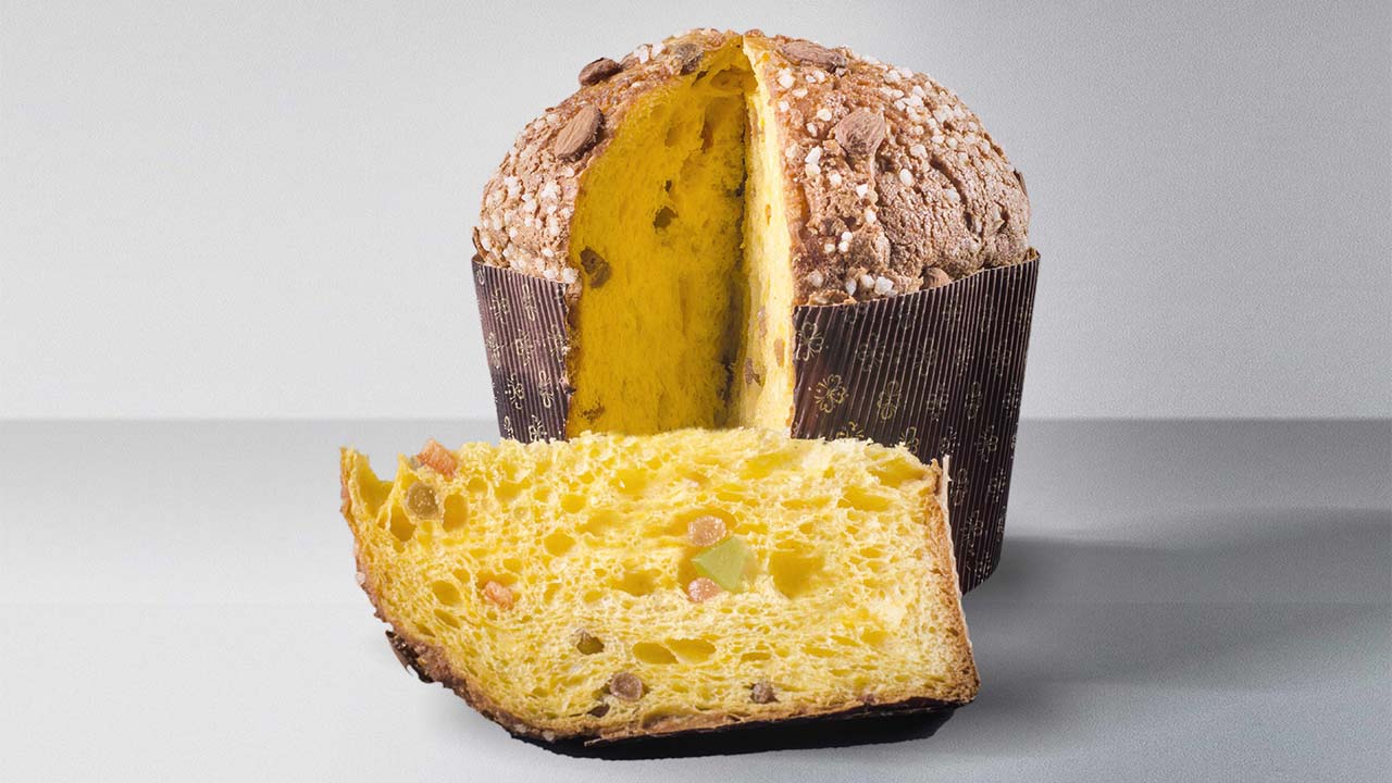 Il panettone dei fratelli Cerea, un’impresa di successo fondata a Bergamo, dal papà Vittorio nel 1966, ristorante tristellato dal 2010, membro dei Relais&Chateaux e della Grandes Tables du Monde. La fetta è fragrante, ben idratata, con note di agrumi, nocciola, vaniglia e un ricordo piacevolissimo di passito, insieme all’indovinato cruch della glassa, con granella di zucchero e mandorle tostate. Accurato e meticoloso il procedimento che prevede lievito madre a tre rinfreschi con impasto serale, lievitazione notturna, un secondo impasto mattutino e ancora una lievitazione precottura. Di altissimo profilo, gli ingredienti impiegati, a partire dal germe del chicco del frumento, che conferisce un maggiore apporto proteico nel corso della lievitazione, burro d’affioramento, che facilita la concentrazione, burro liquido da deframmentazione naturale, che rende più fondente la consistenza al palato e ancora miele di zagara, scorze d’arancio candite senza conservanti, cedro, uvetta, tuorli d’uovo, mandorle siciliane bio. Ma c’è anche la versione con gianduia fondente, gocce di cioccolato al 55% e pralinato alla nocciola.